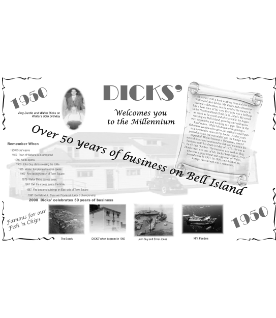 Walter became a fisherman, owned several boats and continued to fish and maintain his business until his death in May of 1979. He was to be 67 that October. The business was sold to, Reg Durdle who was one of Mr. Dicks' best friends. Avis who was a great friend and supporter of Walter, passed away in 1991. In 1993, one third of the lounge, was turned into a restaurant.